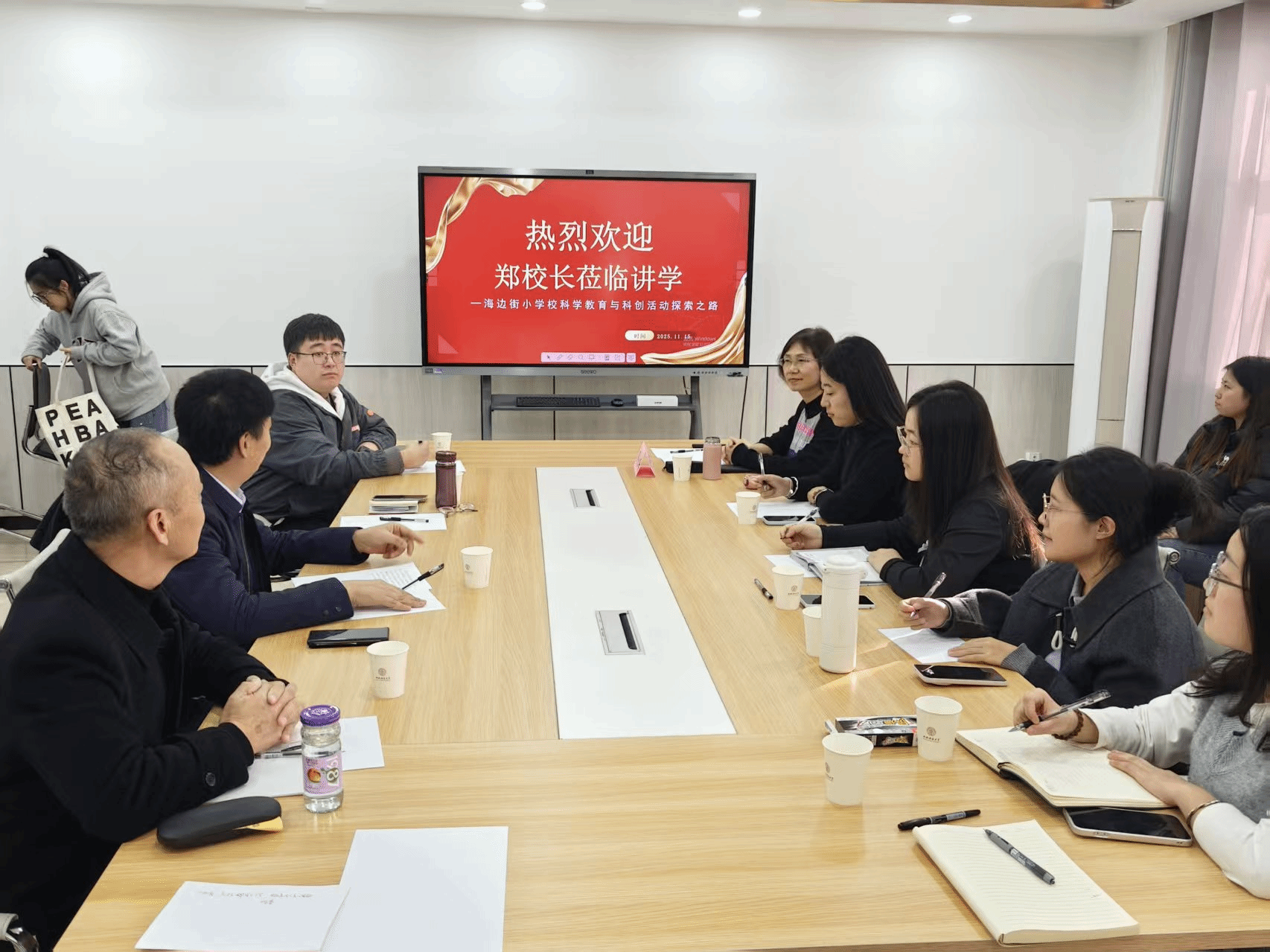 2025年11月15日上午9:30在山西师范大学行政南楼501,太原市迎泽区海边街小学郑永梅校长以“从‘观云测天’到‘格物致知’”为主题,分享了学校依托气象科技推进科学教育的创新实践。李志河教授担任主持人,参会人员有我校科学与技术教育、小学教育专业全体硕士研究生。